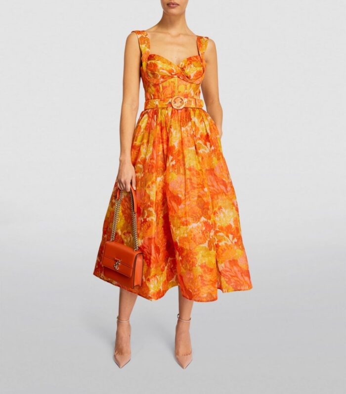 Embrace the essence of summer in our Zimmerman High Tide Floral Print Dress in orange, a vibrant and playful addition to your wardrobe. Crafted with meticulous attention to detail, this dress features a striking floral print in hues of orange, evoking the warmth of a sun-drenched garden. The flowing silhouette and delicate fabric create a sense of effortless elegance, while the high neckline and ruffled detailing add a touch of romance. Perfect for brunches, garden parties, or beachside soirées, this dress exudes feminine charm and sophistication. Elevate your summer style with the Zimmerman High Tide Floral Print Dress in orange, exclusively at Glamoholic Apparel.