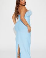 The light blue color of this dress evokes a sense of freshness and tranquility, perfect for warm-weather occasions or beach weddings. The soft hue complements a variety of skin tones and adds a pop of color to your wardrobe.