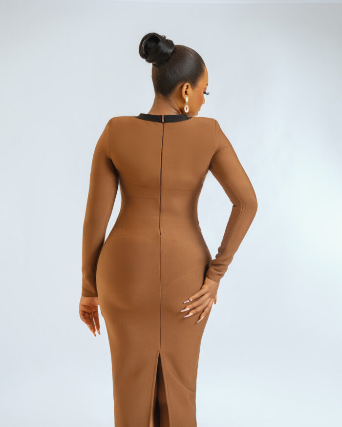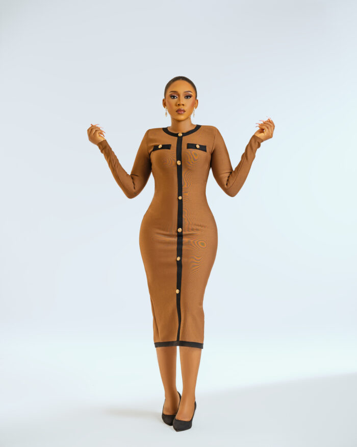 Elevate your wardrobe with our Brown Long Sleeve Button Down Bandage Midi Dress, a chic and sophisticated piece that exudes timeless elegance. Crafted from high-quality bandage fabric, this dress offers a figure-hugging silhouette that accentuates your curves in all the right places. The classic button-down design adds a touch of refinement, while the midi length and long sleeves provide coverage and versatility. Perfect for both daytime events and evening soirées, this dress transitions effortlessly from desk to dinner with ease. Embrace understated glamour and sophistication with our Brown Long Sleeve Button Down Bandage Midi Dress, your new wardrobe essential.