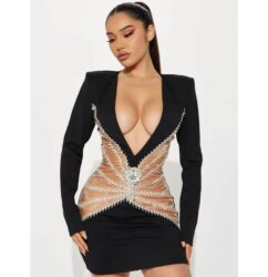WOMEN’S SEXY LONG SLEEVE RHINESTONE TASSEL V-NECK PATCHWORK MINI DRESS